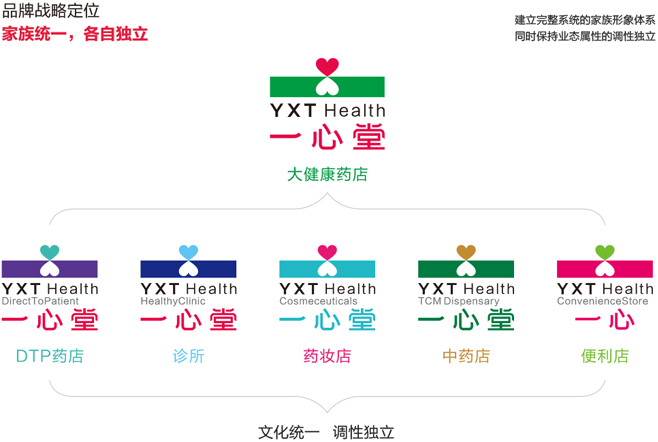 一心堂未來是要構建多業態大健康產業鏈的,集團旗下會有很多業態,那么怎么才能先通過品牌外在形象實現一開始定下的“家族統一,業態獨立”的品牌戰略定位呢?