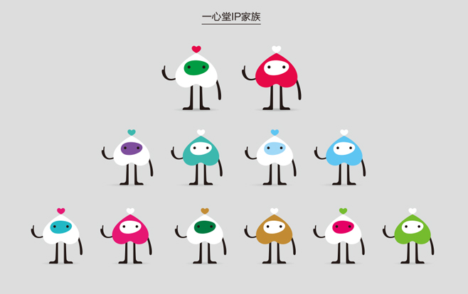 因為不同業態的品牌形象已經發生轉變,在加強單個業態內與品牌形象的關聯性的同時配合品牌進行調整。他們的形象不變,名字不變,他們永遠是“一一”和“心心”,只是身上的顏色(衣服)發生了變化。這樣,整個IP家族就是一心堂業態的代表。