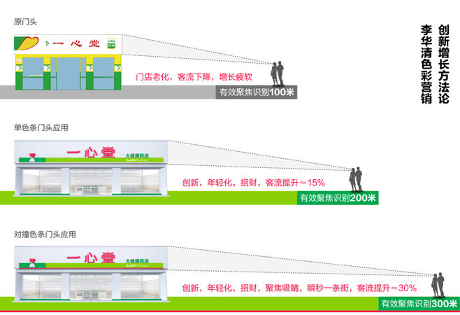 經過我們李華清研究小組的測算分析,如果一心堂原來的門頭只能讓人在百米開外看到,那么加了色條的門頭就能夠在200米內引導人們的視線;而將綠色條下再襯以高反差的紅色,就能夠在300米內視線聚焦。讓整條街道都能看到一心堂,實現焦點引流。
