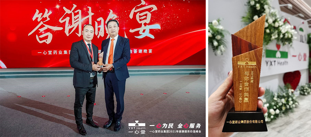 會(huì)場(chǎng)晚宴的頒獎(jiǎng)環(huán)節(jié),董事長(zhǎng)阮鴻獻(xiàn)先生親自為李華清團(tuán)隊(duì)頒發(fā)了“與你合作共贏”獎(jiǎng)杯,這是近一年來(lái)一心堂集團(tuán)對(duì)李華清團(tuán)隊(duì)的最大肯定和鼓勵(lì)。同時(shí),也為我們雙方開(kāi)啟第二階段工作提供了堅(jiān)定的信心。