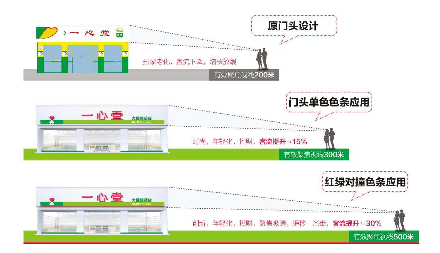 法國(guó)色彩大師郎克羅說(shuō):“完善的色彩計(jì)劃可以讓產(chǎn)品(服務(wù))在不增加成本的情況下,提高其15-30%產(chǎn)品(服務(wù))價(jià)值或利潤(rùn),這就是色彩的力量。” 在門(mén)頭設(shè)計(jì)開(kāi)發(fā)的時(shí)候,我們利用色彩的視覺(jué)牽引特性和二級(jí)門(mén)頭立體發(fā)光效果,并打破了標(biāo)志與名字齊平的傳統(tǒng)組合方式,將LOGO應(yīng)用在下方,與淺綠色條共同起到承載和視覺(jué)牽引效果,形成一心堂門(mén)店全新的品牌資產(chǎn)。二級(jí)門(mén)頭的“紅,綠色條對(duì)撞”是一心堂門(mén)頭殺手級(jí)的色彩應(yīng)用策略,因?yàn)樵谒泄獠ㄖ屑t色光的波長(zhǎng)最長(zhǎng),而綠色的可視函數(shù)最高,也更容易聚光,這就是激光筆為多用綠光的原因,當(dāng)這兩個(gè)補(bǔ)色并列時(shí),會(huì)引起強(qiáng)烈對(duì)比的色覺(jué),會(huì)感到紅的更紅、綠的更綠。從而就能快速實(shí)現(xiàn)百米聚焦,瞬秒一條街,為藥店引流、招財(cái)、增量。